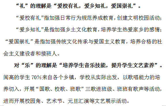 学校办学特色基于传承、与时俱进,立足校情生情,并结合立德树人和“五育”并举落地、落细、落实的要求,对文化传承与创新进行时代思考。闽清高级中学在传承礼乐文化时不断创新丰富“礼乐海岩·美好闽高”的办学特色,也赋予“礼乐海岩”崭新的内涵。 “礼乐海岩”的内涵